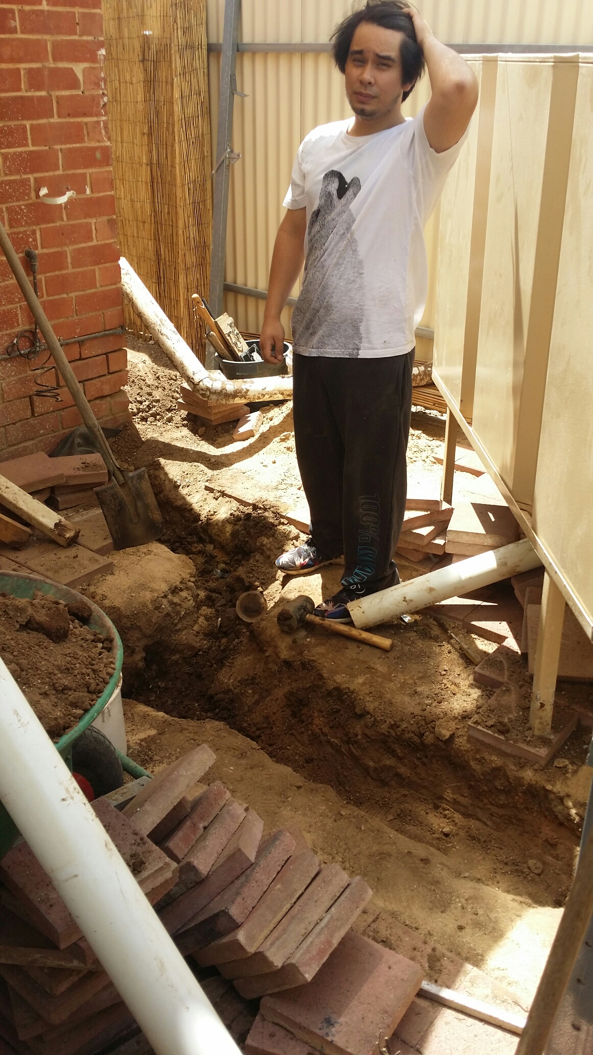 Lon and I decided to redo the drainage at one end of the house in order to take the overflow away more effectively. What was planned to be a shallow, 3’ trench turned horrible when we discovered that the previous owners used 90mm pipe that had been squashed into a flat oval, so we had a hell of a time attaching joiners and elbows. It was then revealed to us that the pipe sloped so that the water fell toward this end of the house instead toward the rest of the drainage and outlets.