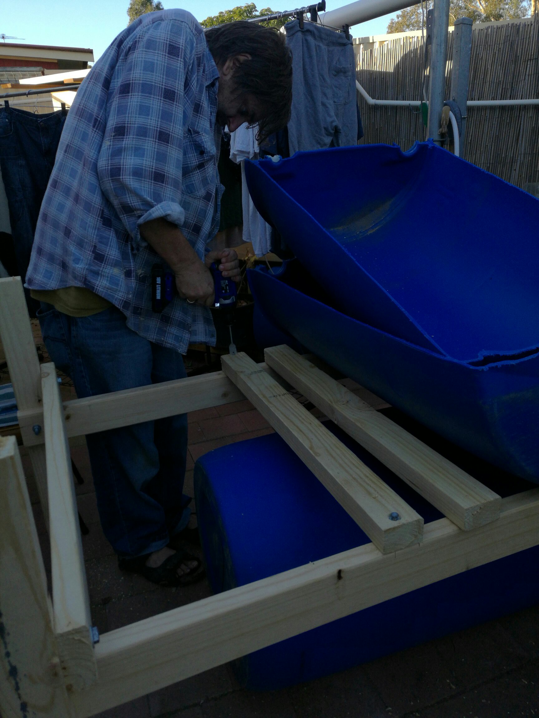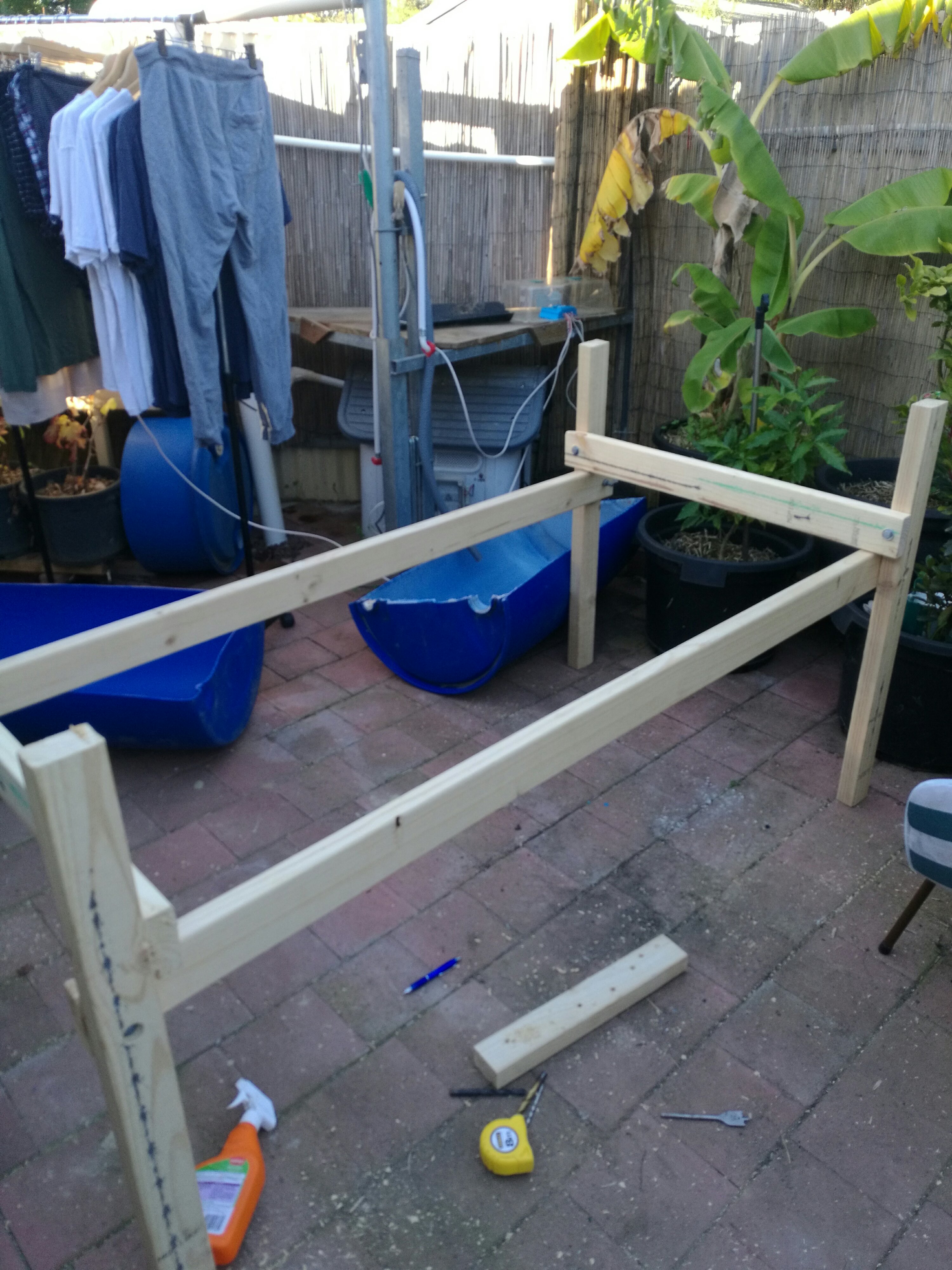 We’re well underway with the aquaponics build. The frame is almost done, though I couldn’t take a pic of it almost finished because it came in too dark too quickly. Jelina just managed to capture me hard at work