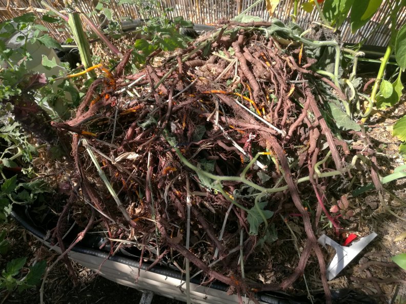 While I was at it, I pulled up all the irrigation in that area to redo when we put in out tuber garden. That meant moving all the trellises that shade the wicking bed in Summer.