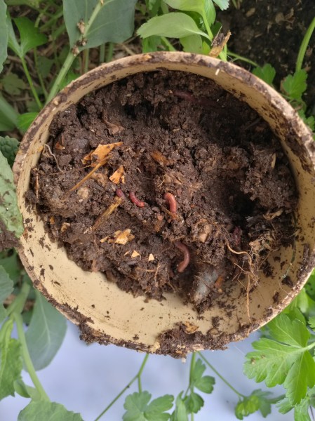 Once I’d pulled all that out, the rest was pretty well as expected, a rich blend of broken down vegetable scraps, chicken bones and egg shells. It too seemed quite dense. Maybe I’d been putting too much organic material in the tower during my periodic top ups.