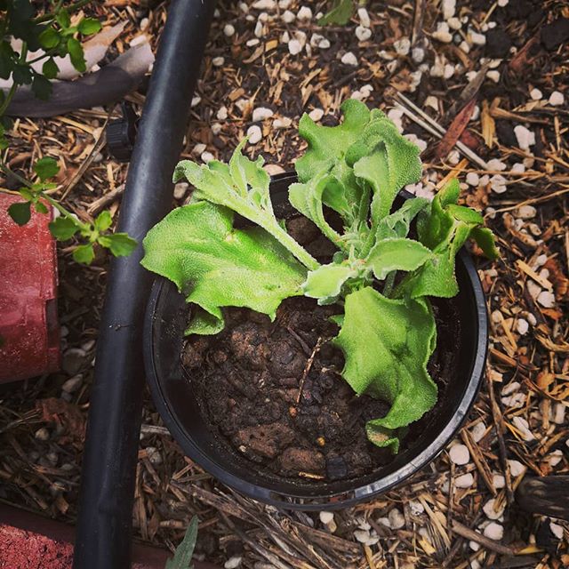 It’s an Ice Plant (Mesembryanthemum crystallinum) that sone friendly person left by our gate. Thanks whoever it was… These are delicious!
