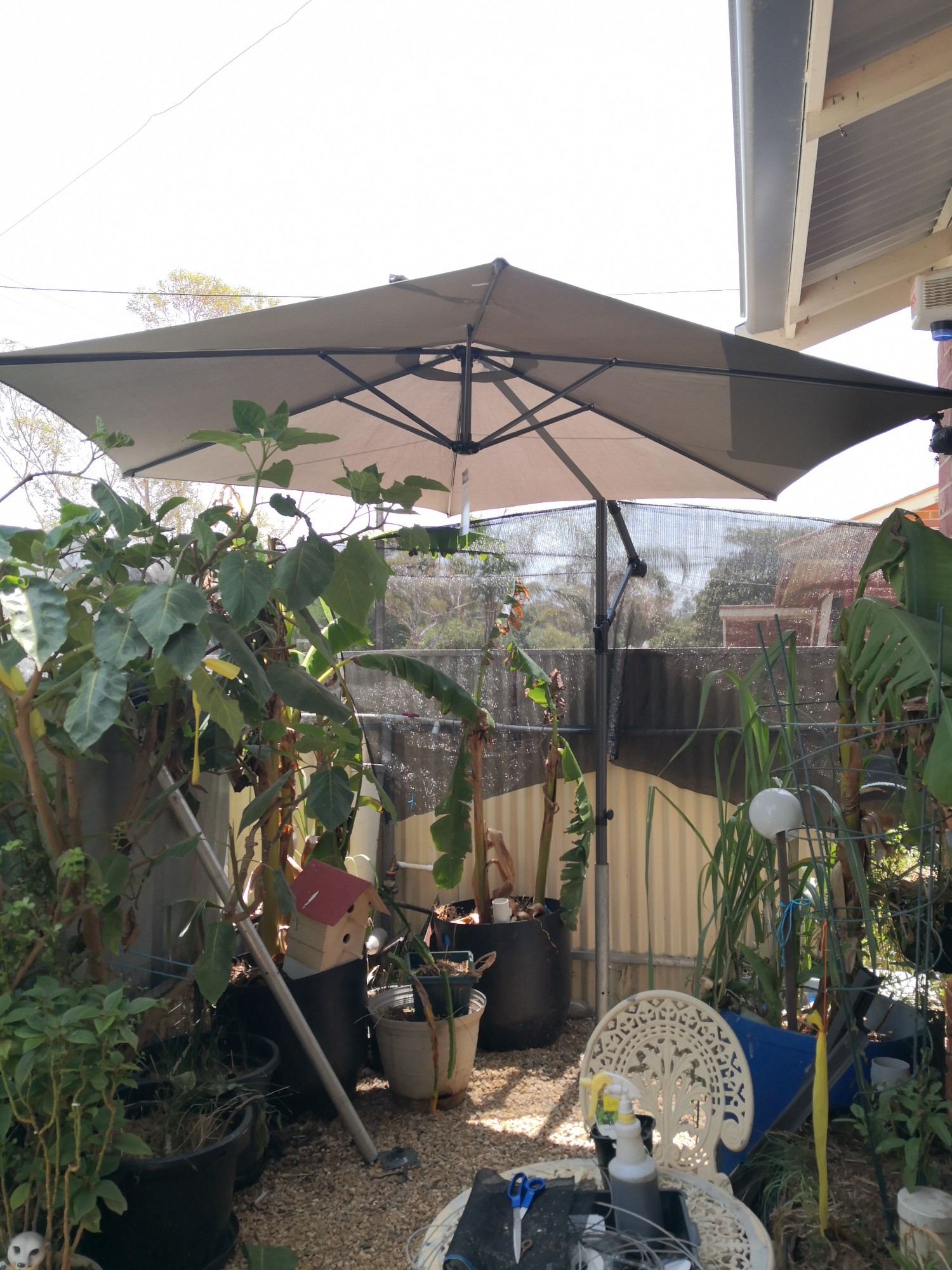 I gave it some thought and coincidentally one of our local hardware stores had big 3 metre cantilevered shade umbrellas out for cheap. They even have a winder on them. I bought two to try them out.