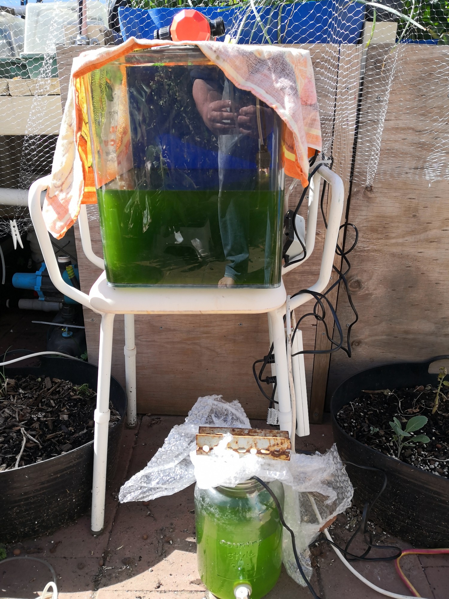 The plan is to (eventually) have the culture in 8 of those big glass bottles with taps to make the harvesting easy. That’s a harvest from one bottle each day of the week with one spare to ensure that the Spirulina in each bottle gets back up to strength.