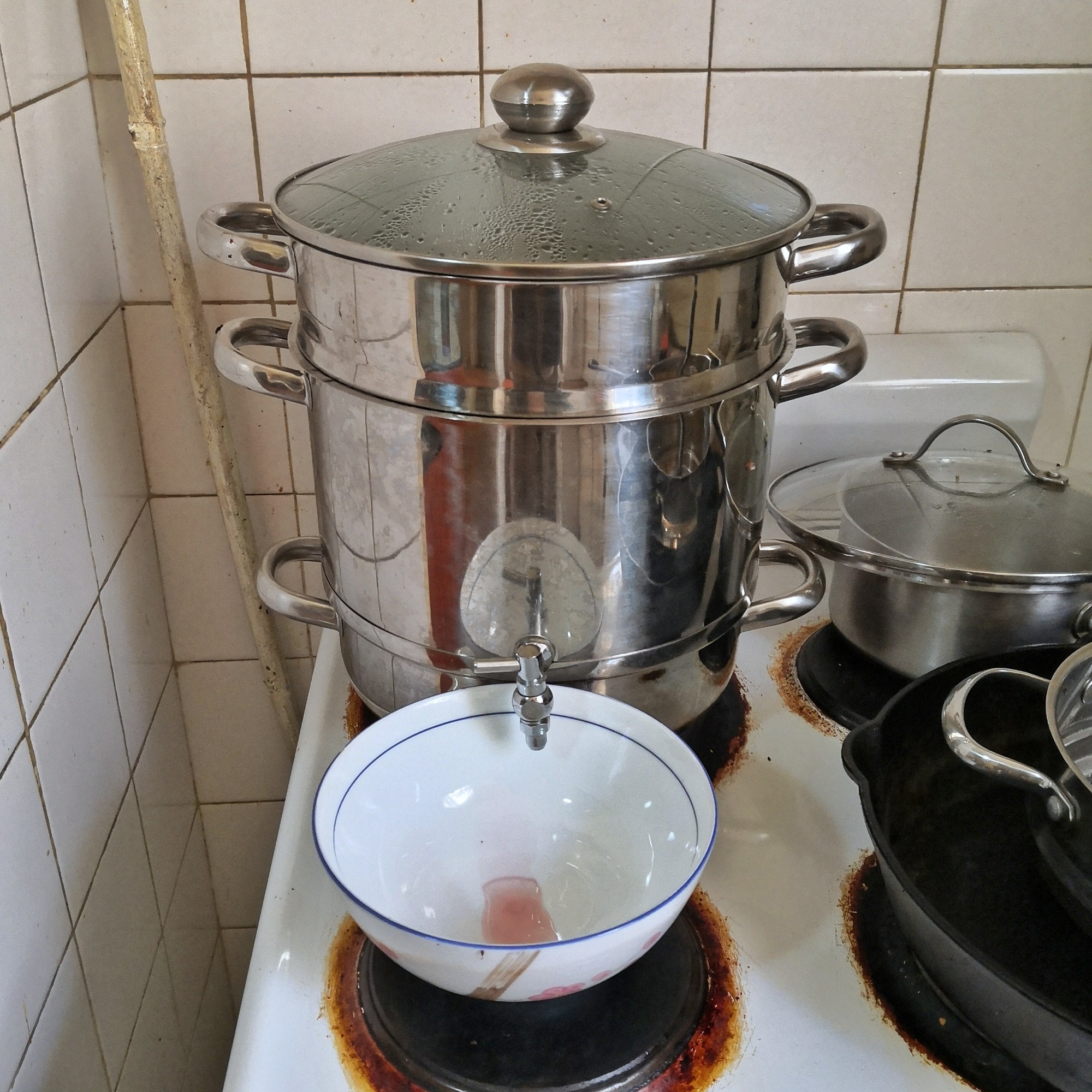 The steam juicing unit has a lid, a colander, a middle piece with an cone to allow steam up but catch the juice. This piece has a catchment area and a tap. Below that is a pot.