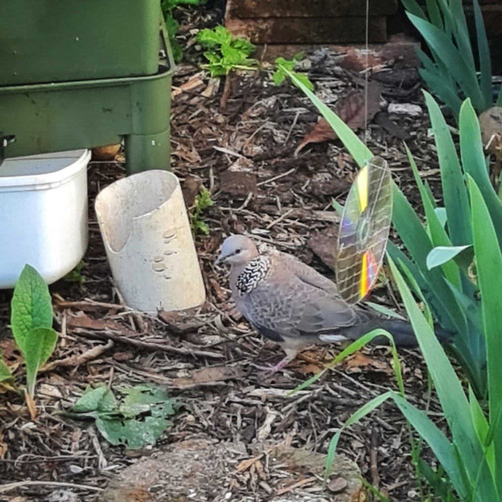 Her babies are out cleaning up the garden and cleaning up the grain that I’ve dropped near the chook house. They’re cute too, they only stay a foot or so ahead of me when I’m walking and walking along the path is done at Dove speed. They even and sit on the fence when I’m doing any gardening. One youngster even sits on the gate while it swings open!