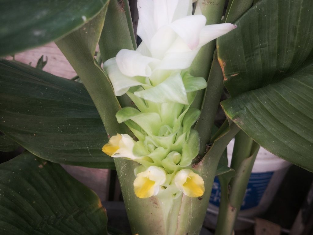 The leaves and stem can reach 1 metre tall pretty quickly. Flowers come later. Turmeric flowers are a spike that comes directly from the rhizome and consist of an upper layer of sterile bracts of a white/cream colour with fertile flowers below which may be tinged yellow or pink.