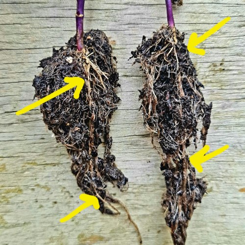 There may be a clump of massed roots left over. Pinch this off and discard it. You can see the ball of extraneous roots on the sample on the right, in the above pic.