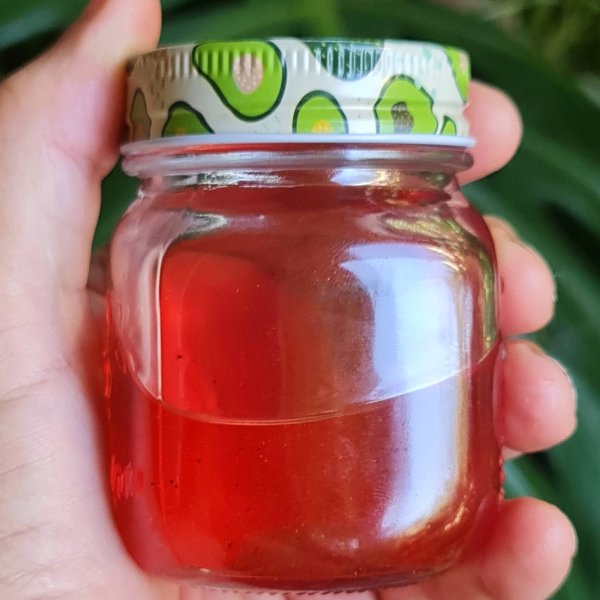 It’s an interesting plant in that the oil squeezed from the yellow flowers is a dark red. In my first year of harvesting, my hands looked like I was an actor in Macbeth! I had crushed so many petals with my clumsy technique. This year though, a mild reddening of index finger and thumb was all, as I’d learned how to be a bit more delicate. The bloody red pic below shows how much oil can come from one flower.
