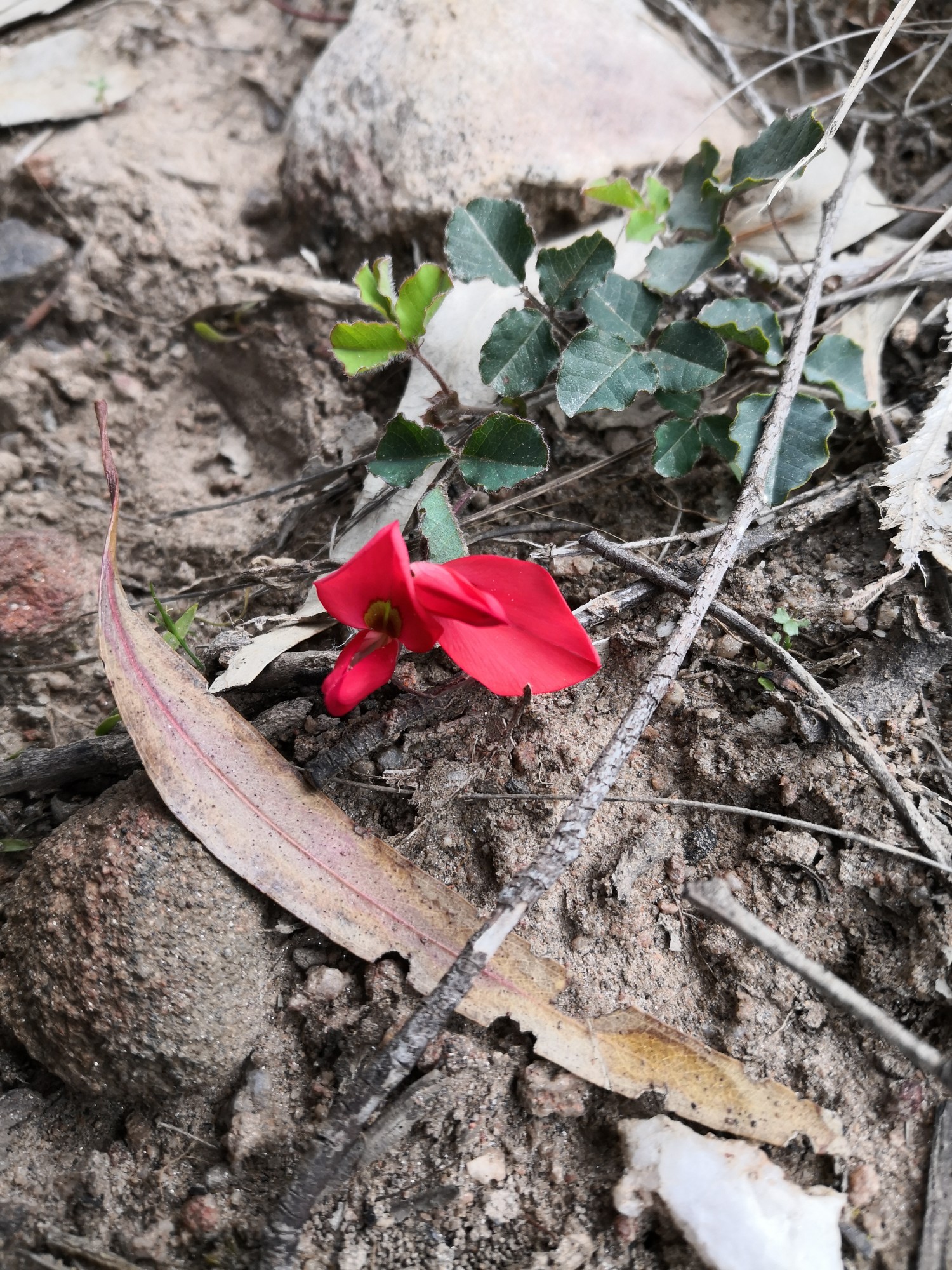 Running Postman (Kennedia prostrata) is one of the delights of the bush. Its bright red and yellow flowers are easy to spot and I think are named after the uniform of postmen from a bygone era. Its other, lesser used, common name is ‘Bacon and Egg plant’ for the same reason.