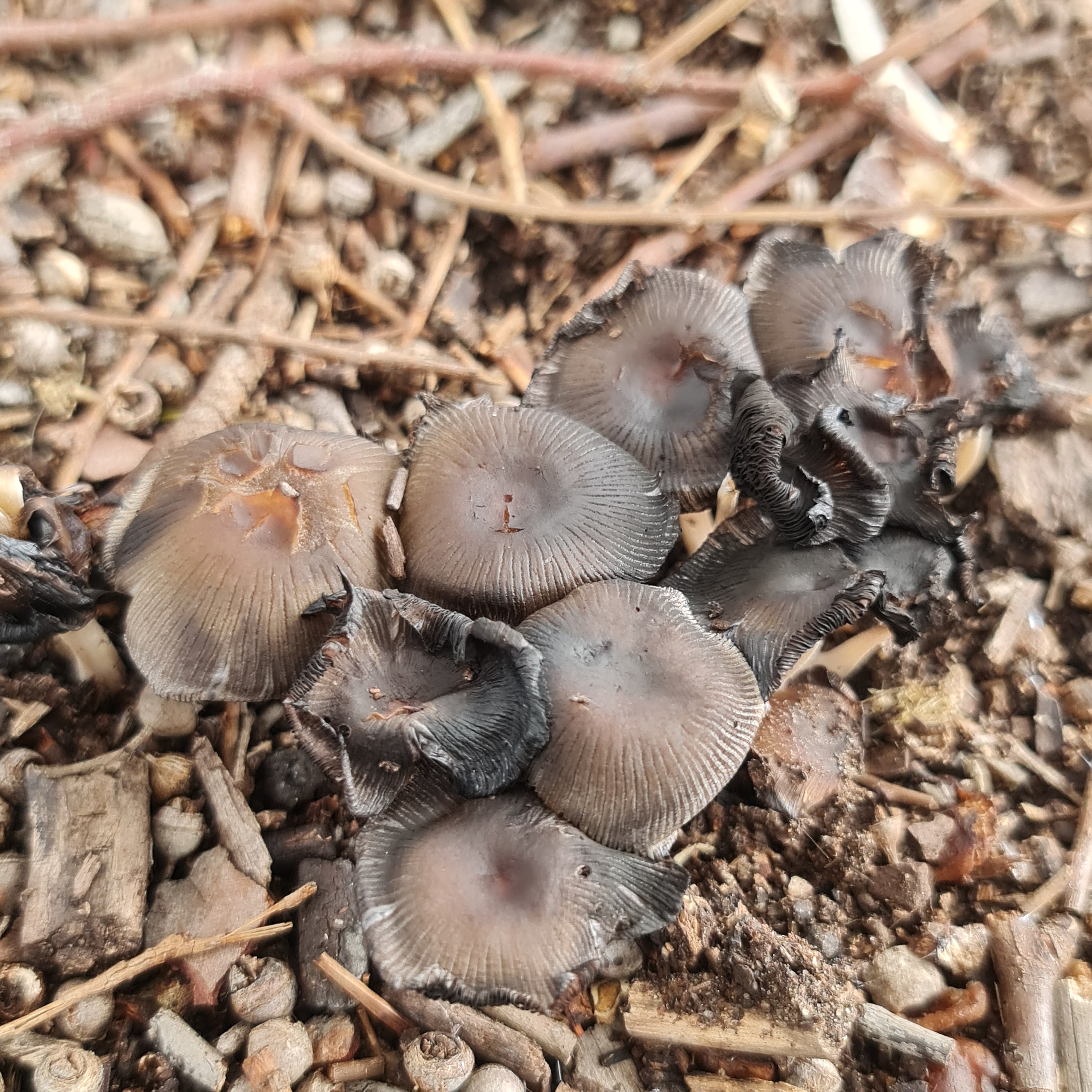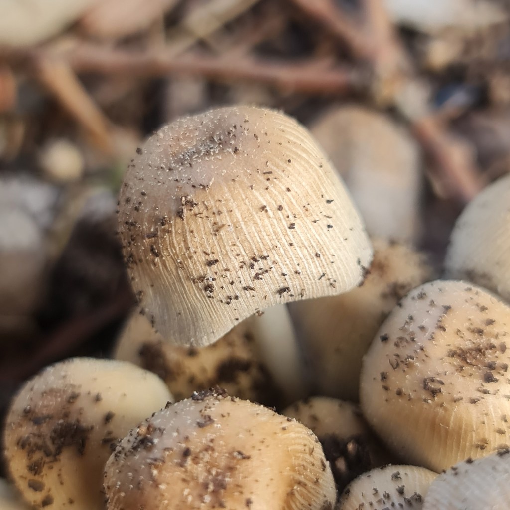 Mica Caps (Coprinellus micaceus) are common inhabitants of roadside verges, gardens, and parks. Their large colonies fruit in the same place, year after year, and elicit many comments as they deliquesce (turn to goo) at the end of their fruiting.