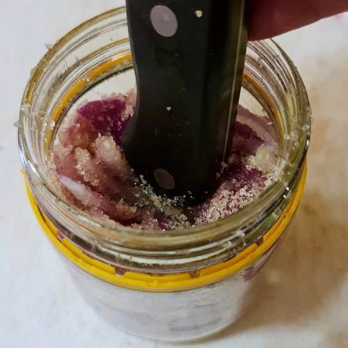Layer them into a jar, alternating or mixing with sugar as you go. I like to press it all down to break up the onion a little more and really pack the sugar in.
