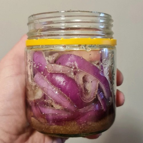 If you want, you can leave it overnight to draw that little bit extra out. I sit it on a filter funnel or seive overnight so that pure drips below. Another trick is to get 10 ml or so of water and pour it over the finished onions to wash off that little extra. You can even swirl the onions in a glass of water together a sweet onion tanged drink if you want to go that far.