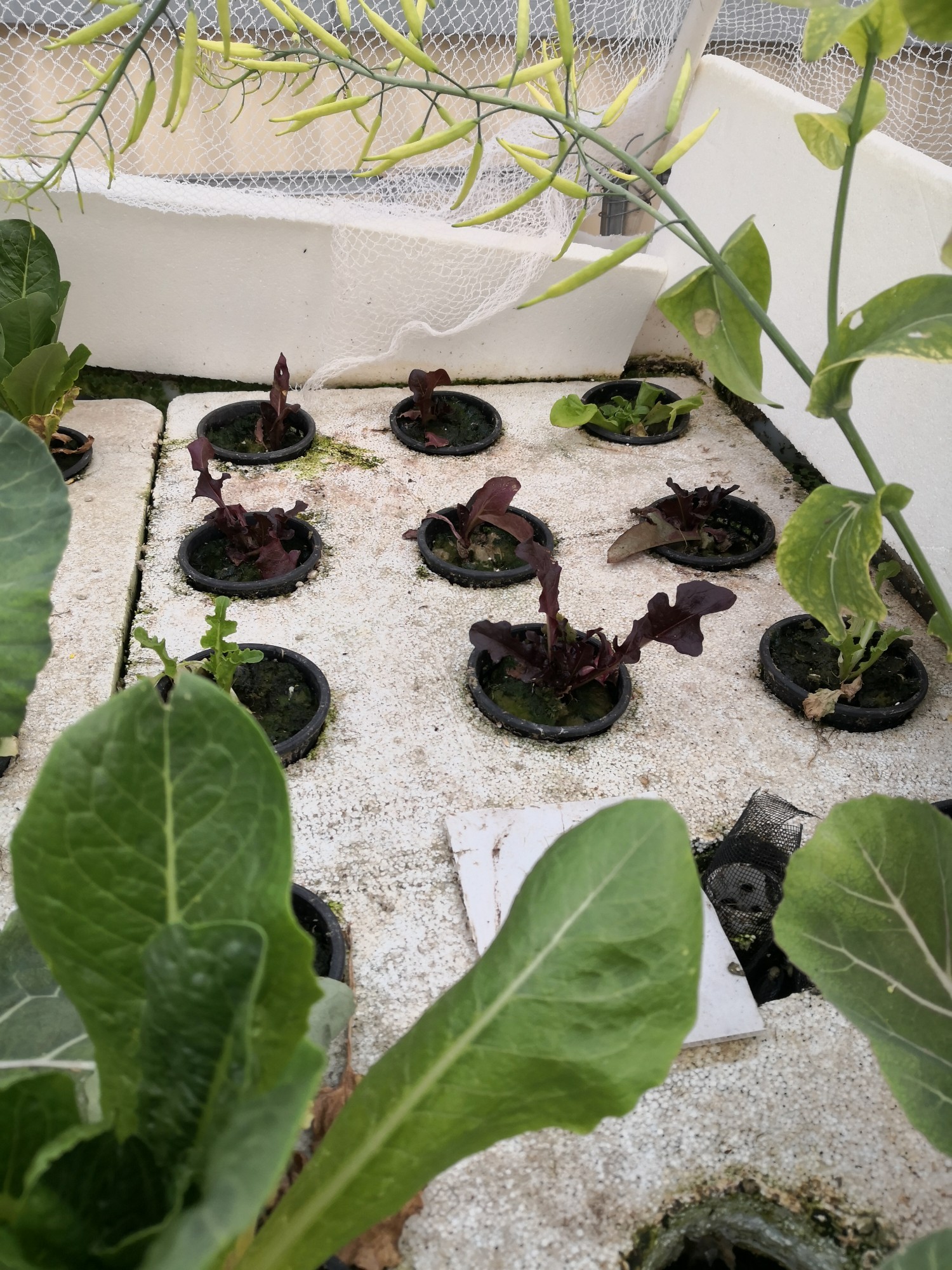 As there are not enough fish to run the system as purely ‘aquaponics’, I add soluble fertilizers at regular intervals. These fertilizers are a mix of seaweed solutions, commercial soluble fertilizers, commercial hydroponics nutrients and home made liquid fertilizers.