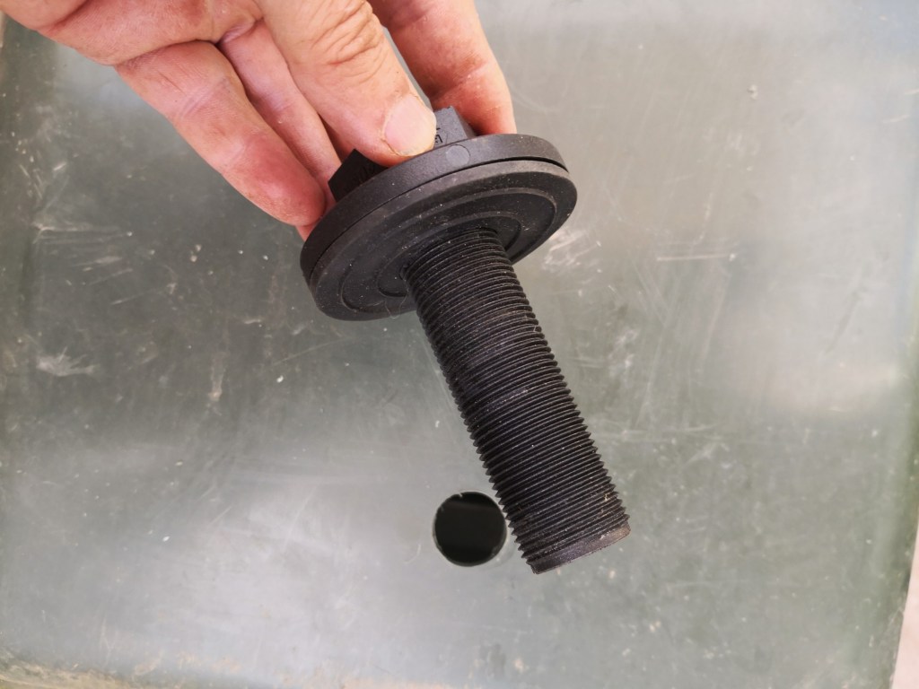 Insert the fitting through the hole so that the longest part of the thread is on the outside of the bin.