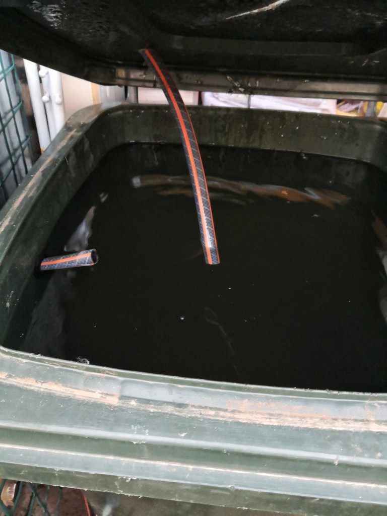 The additional parts cost about $25 from our local Mitre 10 hardware store and are dead easy to add to the bin, giving you a covered, mobile rain tank (though I wouldn’t try using one when its full of water. 240 litres weighs 240 kilograms!