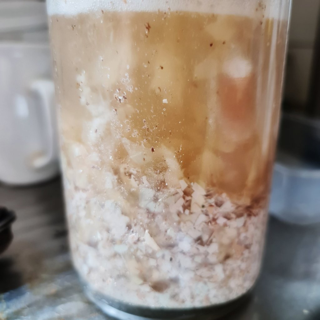 You don’t need to be as fussy with eggshells as you do with bones. If I’m not making an extract that will be stored, I just wash them, crush them up a bit and add the vinegar. After the second round of vinegar, the pieces of lining will float to the surface with the bubbles, and you can just skim them off.