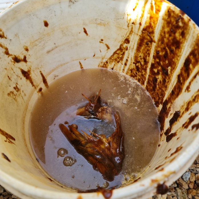If you’ve been fermenting anything else, wash your containers with a bit of vinegar to clean them. and extract a little extra. I do this for the fermented fish extract containers that can get sticky and gooey. The vinegar cuts right through this, and the liquid can be used as an additive to the fermented fish extract itself.
