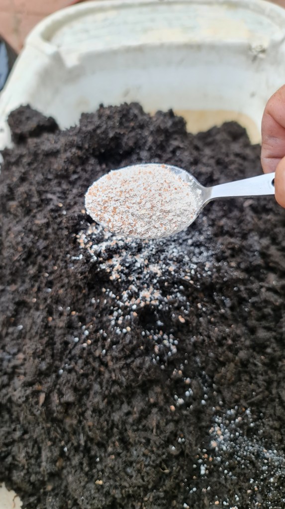 You don’t have too much, a teaspoonful is enough for a 50 litre pot. You just have to make sure that you mix it through your medium and that it doesn’t all end up in one place.