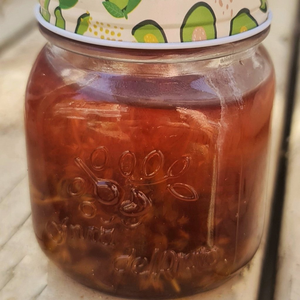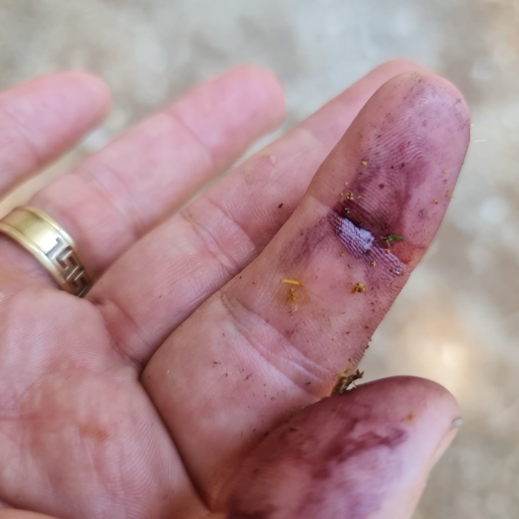 It’s an interesting plant in that the oil squeezed from the yellow flowers is a dark red. In my first year of harvesting, my hands looked like I had been an actor in a performance of Macbeth! I had crushed so many petals with my clumsy technique. This year though, a mild reddening of index finger and thumb was all, as I’d learned how to be a bit more delicate. The bloody red pic below shows how much oil can come from one flower.
