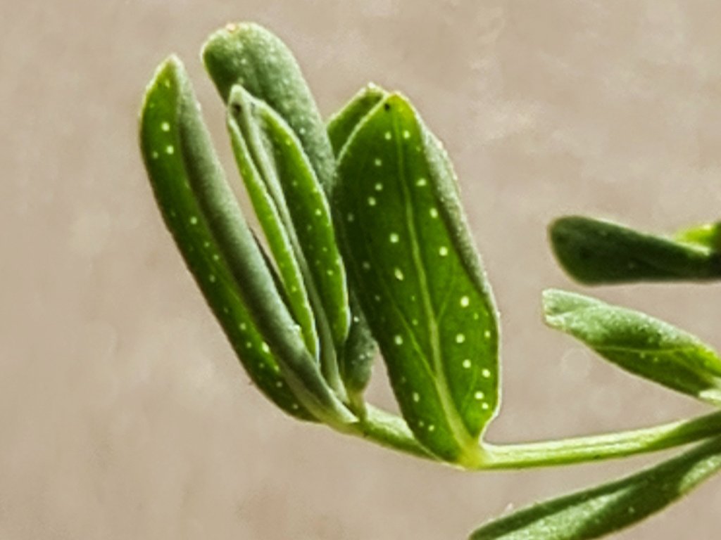 Leaves are opposite with smooth margins and rounded ends. If you hold a leaf up to the light, you will see the transparent oil glands that let light shine through.